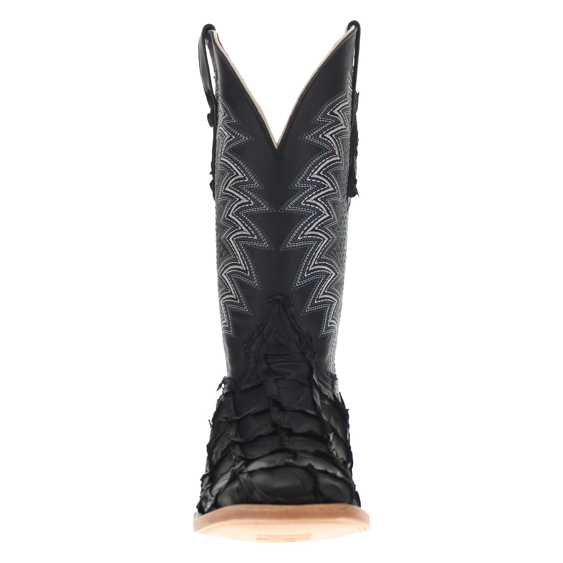 These men’s square toe pirarucu fish cowboy boots are a unique and bold fashion statement. The uppers of these boots showcase an intricate grid stitch pattern, adding a distinctive and eye-catching element to the design. Crafted from exotic pirarucu fish leather, these boots combine style with a touch of the wild, making them a striking choice for those who want to stand out in the crowd.